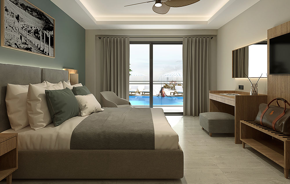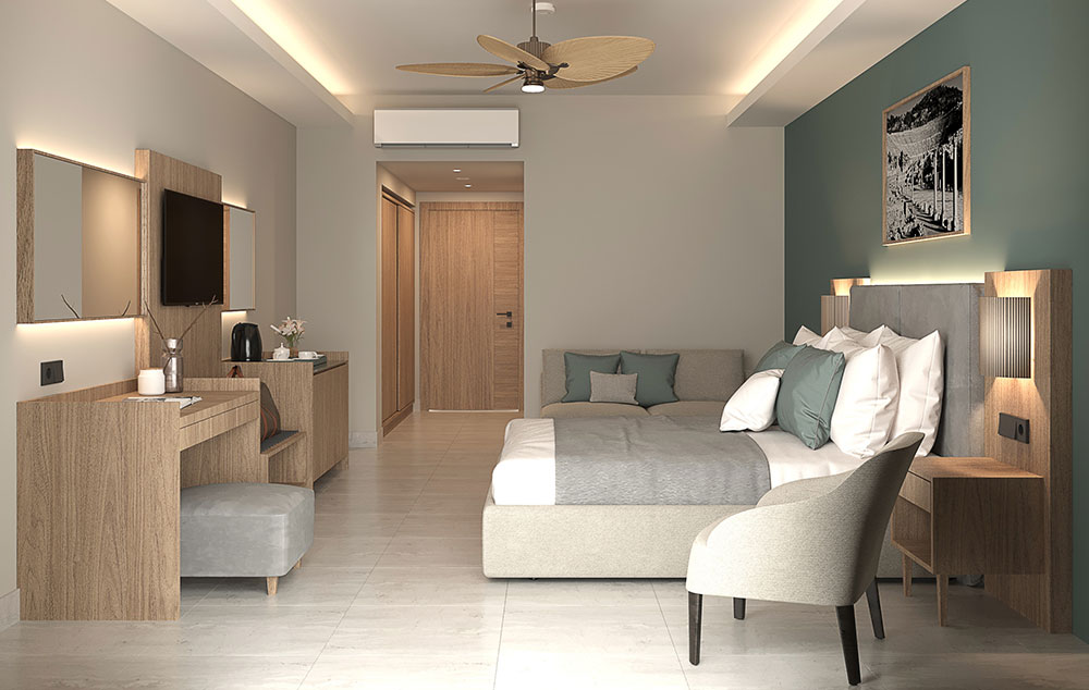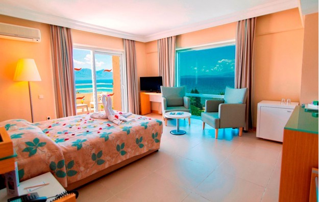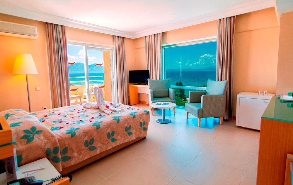 Sobe: raspolaže sa 263 sobe. Standardne sobe mogu biti sa pogledom na kopno ili delimičnim pogledom na more, površine od 25-30m2 i imajukupatilo sa tušem /wc, SAT TV, fen za kosu, klima uređaj, mini bar, sef (uz doplatu), telefon, wifi (uz doplatu). Većina soba ima balkon. Maksimalno borave 2 odrasle osobe i 2 dece do 11 godina.