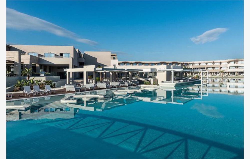 Hotelski kompleks sastoji se od 6 zgrada sa po dva sprata i ima ukupno 344 soba, inspirisan je idejom porodičnog odmora i svim gostima pružiće uslugu i sadržaje visokog kvaliteta. Od hotelskih sadržaja hotel poseduje pet restorana (tematski restorani jednom besplatno u toku boravka uz prethodnu rezervaciju), suvlaki snek kutak, glavni bazen jedan od najvećih u Grčkoj površine 3500m2, a la carte restoran pored bazena, lobi bar, 2 bara pored bazena, bar na plaži,, bazen za decu sa 4 tobogana, ležaljke i suncobrani na bazenu i plaži, peškiri za bazen i plažu, 2 fitness centra, Harmonia spa centar (sa zatvorenim bazenom, saunom, đakuzijem, parnim kupatilom) je za starije od 18 godina, teretana, stoni tenis, teniski teren i oprema-besplatno, bazen za bebe (3 meseca+), paket dobrodošlice svima po dolasku, parking. Veliki Akva park sa 4 tobogana i Vodenim tornjem je deo na koji je ovaj hotel posebno ponosan, jer je to mesto gde za najmlađe zabava počinje. Za decu raznih uzrasta, hotel ima dnevne aktivnosti kroz mini klub i igralište, a na raspolaganju je i servis za čuvanje dece i soba za igru. Animacija za odrasle je predviđena svakog dana. Hotel je prilagođen osobama sa invaliditetom.