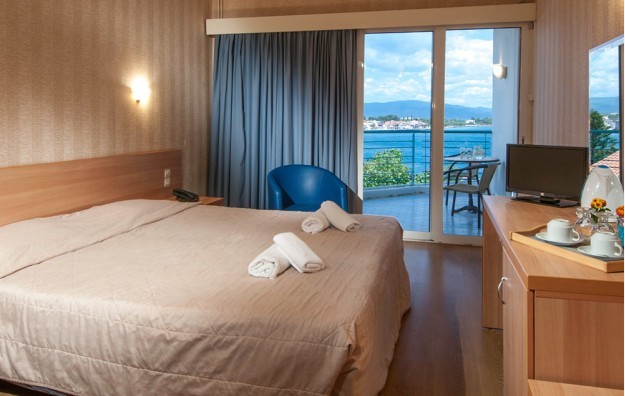 Standard room- Oko 26m2, sa bočnim pogledom na more, opremljen bračnim krevetom, 1 krevetom za jednu osobu i pomoćnim ležajem za 2. dete.
