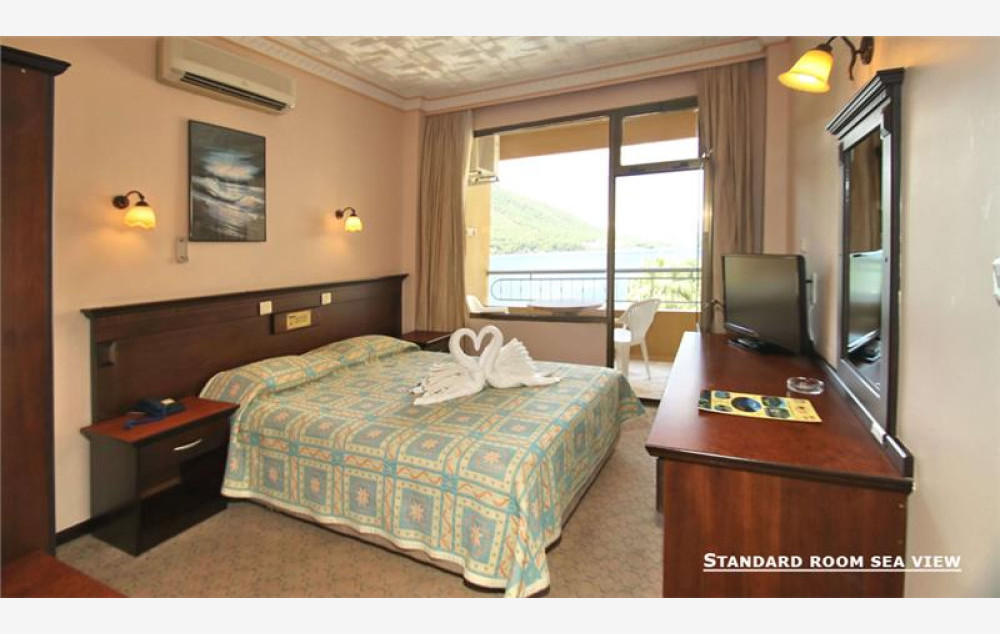 Sobe: hotel se sastoji od tri bloka u kojima je raspoređeno 170 eosba. Standard sobe sa pogledom na more (maksimalno borave 3 odrasle osobe) i bočnim pogledom na more (maksimalno borave 2 odrasle osobe i 2 dece do 12 i 7 godina), su površine 20-23m2 i imaju kupatilo (tuš/wc i fen za sušenje kose), klima uređaj, SAT TV, mini bar (uz doplatu - dostupna je samo flaša vode na dan dolaska), telefon, balkon. Family sobe su površine 30-32m2 i isto su opremljene kao standard sobe. Maksimalno borave 4 odrasle osobe.