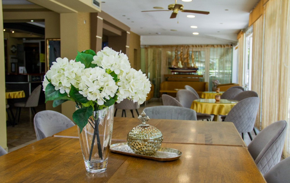Opis: U našoj ponudi su dvokrevetna, trokrevetna i četvorokrevetna studija, smeštena na prvom i četvrtom spratu. Svaki poseduje opremljen kuhinjski deo, kupatilo/wc, terasu, TV, WiFi internet i klima uređaj (uključen u cenu aranžmana). Objekat poseduje recepciju, lift, loby bar, roof garden, a ispred hotela je park. U hotelu je čišćenje svakodnevno, promena peškira svakog drugog dana. U ponudi su usluga najma ili polupansiona (doručak-na bazi švedskog stola, večera-menu).