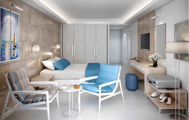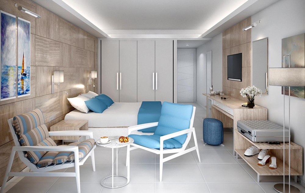 Sobe: standardne sobe sa pogledom na more ili pogledom na baštu, veličine 25-30m2, sa kupatilom (tuš, WC, fen za sušenje kose), telefon, SAT TV, mini-bar, set za čaj/kafu, bežični internet, sef, klima uređaj. Maksimalno borave 2 odrasle osobe i 2 dece do 13 i 3 godine.