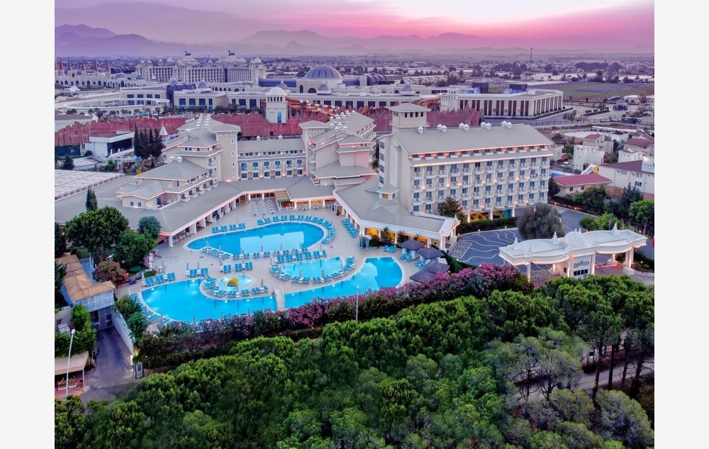 Hotelski sadržaj: Recepcija, 2 glavna restorana, 2 a la carte restorana, dijetalni meni, 13 barova, 2 unutrašnja i 5 spoljašnjih bazena, 5 dečijih bazena, 6 đakuzija, akva park sa 19 tobogana (10 dečijih), bioskopska sala, dnevne i večernje animacije, mini klub (za decu od 4-12 godina), teenage klub (za decu od 13-17 godina), mini disko, igraonica, aerobic u vodi, bocanje, pikado, stoni tenis, odbojka na pesku, teniski teren, košarka, tursko veče, hamam, sauna, parna soba, teretana, bilijar (uz doplatu), wi fi (u lobiju).