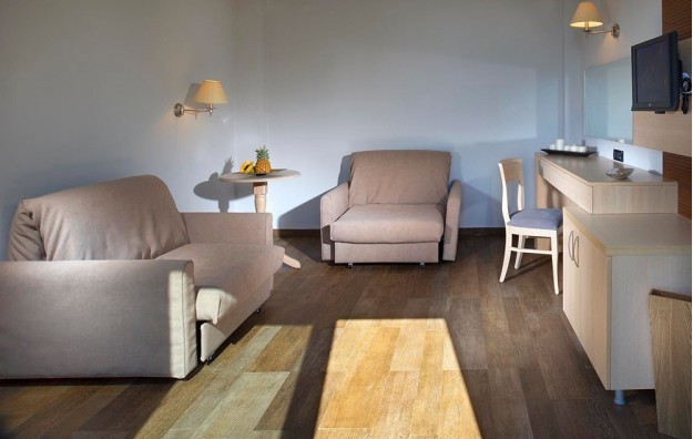 Family suite garden view-oko 45m2, maksimalna popunjenost: 2-4 osobe, specijalno dizajnirana za porodice, sastoji se od spavaće sobe i dnevnog boravka (- može ili ne mora biti odvojena vratima sa bračnim ili tvin sa kaučem na razvlačenje u dnevnoj sobi).