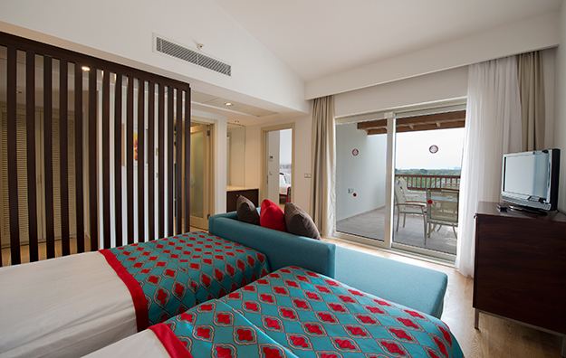 Deluxe soba bočni pogled more i bazen (38-40m2). Maksimalno mogu da borave dve odrasle osobe i dvoje dece do 12 godina ili tri odrasle osobe.
