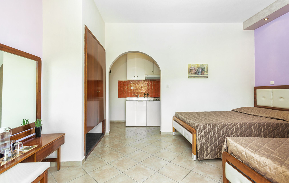 Standard room garden view: 24 m², smešten u prizemlju, s bračnim ili dva odvojena kreveta za 2 osobe, sadrži potpuno opremljen kuhinjski deo.