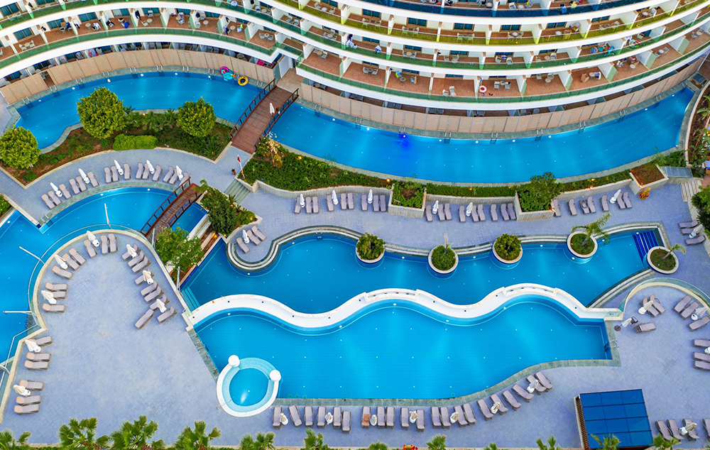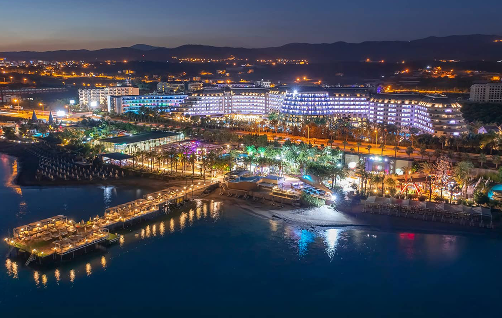 Hotelski sadržaj: Recepcija, 2 glavna restorana, 2 a la carte restorana, dijetalni meni, 13 barova, 2 unutrašnja i 5 spoljašnjih bazena, 5 dečijih bazena, 6 đakuzija, akva park sa 19 tobogana (10 dečijih), bioskopska sala, dnevne i večernje animacije, mini klub (za decu od 4-12 godina), teenage klub (za decu od 13-17 godina), mini disko, igraonica, aerobic u vodi, bocanje, pikado, stoni tenis, odbojka na pesku, teniski teren, košarka, tursko veče, hamam, sauna, parna soba, teretana, bilijar (uz doplatu), wi fi (u lobiju).