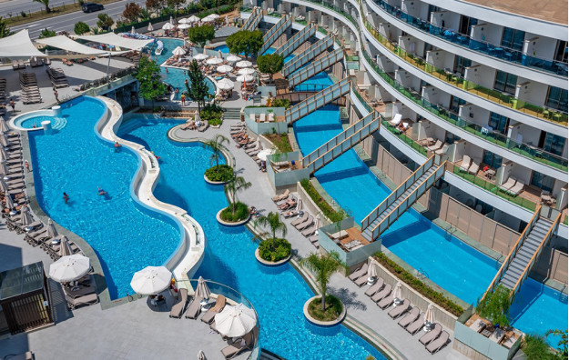Hotelski sadržaj: Recepcija, lift, 2 restorana, lobby bar, bar pored bazena, dva otvorena bazena sa toboganima i odvojenim delom za decu, frizer, mini market, wi fi beplatno u zajedničkim prostorijama.