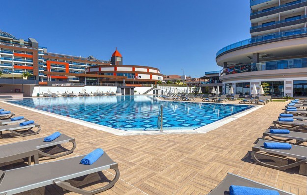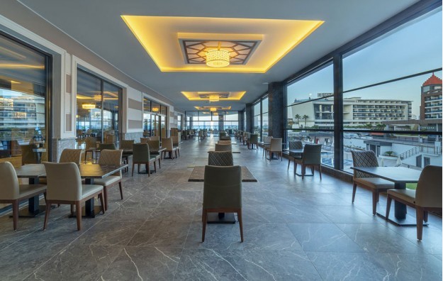 Hotelski sadržaj: Recepcija, 2 glavna restorana, 2 a la carte restorana, dijetalni meni, 13 barova, 2 unutrašnja i 5 spoljašnjih bazena, 5 dečijih bazena, 6 đakuzija, akva park sa 19 tobogana (10 dečijih), bioskopska sala, dnevne i večernje animacije, mini klub (za decu od 4-12 godina), teenage klub (za decu od 13-17 godina), mini disko, igraonica, aerobic u vodi, bocanje, pikado, stoni tenis, odbojka na pesku, teniski teren, košarka, tursko veče, hamam, sauna, parna soba, teretana, bilijar (uz doplatu), wi fi (u lobiju).