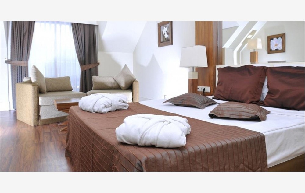 Hotelski sadržaj: Hotel poseduje glavni restoran, 2 a la carte restorana (turski i riblji-korišćenje jednog besplatno u toku boravka uz obaveznu rezervaciju), 2 bara, spoljašnji i unutrašnji bazen za odrasle i decu, večernju animaciju, dečiji klub 8za decu od 4-12 godina), dečija igraonica, mini disko, tursko kupatilo, sauna, masaže, fitness, aerobic, stoni tenis, bilijar, boćanje, pikado, wi fi.