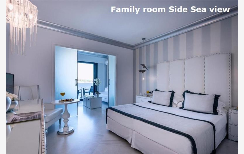 Porodične sobe pogled more površine oko 37m², sastoje se od dve prostorije odvojene kliznim vratima, namenjene za smeštaj 2-4 osobe, sadrže, francuski ili dva standardna ležaja i dva sofa ležaja. Sve sobe su po svojoj osnovnoj strukturi dvokrevetne, dok ostali ležajevi mogu biti pomoćni. Hotel ima u ponudi sobe prilagođene osobama sa invaliditetom (na upit).Bebi krevetac je na raspolaganju gostima besplatno (obavezna najava prilikom rezervacije).