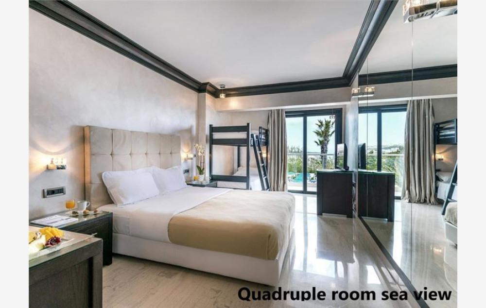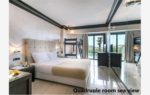 Četvorokrevetne sobe pogled kopno i pogled more površine oko 25 m², namenjene su za smeštaj 2-4 osobe, sadrže dva standardna ležaja i krevete na sprat.