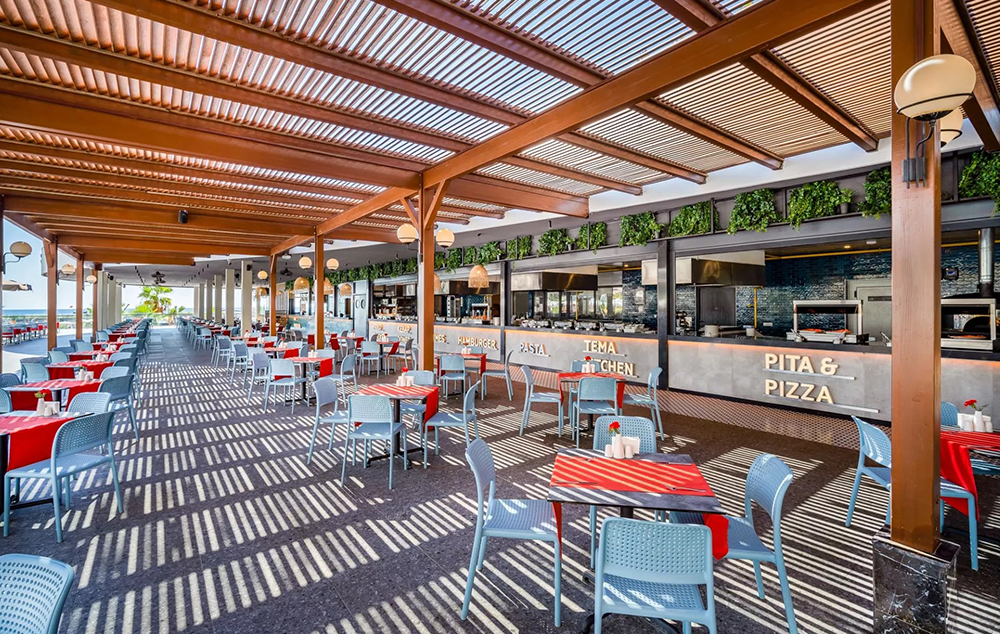 Hotelski sadržaj: Recepcija, glavni restoran, a la carte restoran, lobby bar, bar pored bazena, bar na plaži, bazen sa toboganima i odvojenim delom za decu, poslastičarnicu, mini klub za decu 4-12 god., mini disko, animaciju za decu i odrasle, noćnu animaciju, spa centar (teretana i sauna besplatno, ostalo uz doplatu), wi fi u lobiju je besplatan.
