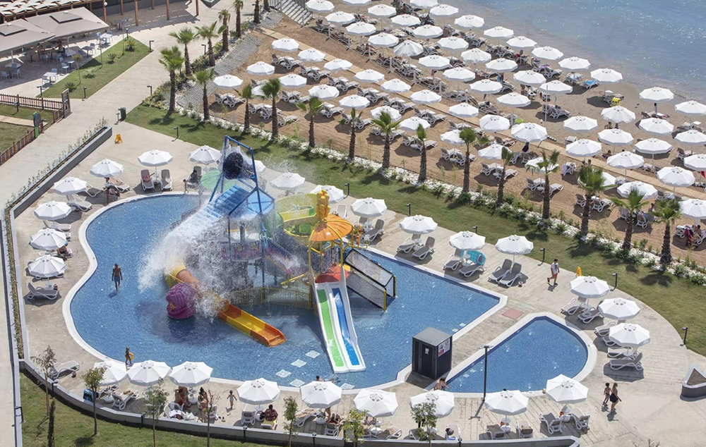 Hotelski sadržaj: Recepcija, glavni restoran, a la carte restoran, bar pored bazena, bar na plaži, bazen za odrasle, dečiji bazen, dva tobogana, dečije igralište, dnevnu animaciju, večernji mini disko, fitness, tursko kupatilo, saunu, stoni tenis, bilijar, wi fi se doplaćuje.