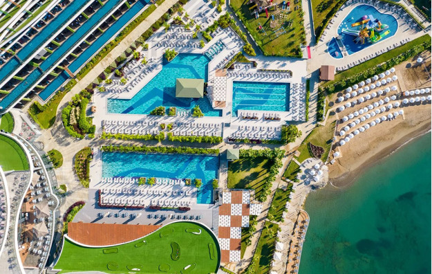 Hotelski sadržaj: Recepcija, 2 glavna restorana, 2 a la carte restorana, dijetalni meni, 13 barova, 2 unutrašnja i 5 spoljašnjih bazena, 5 dečijih bazena, 6 đakuzija, akva park sa 19 tobogana (10 dečijih), bioskopska sala, dnevne i večernje animacije, mini klub (za decu od 4-12 godina), teenage klub (za decu od 13-17 godina), mini disko, igraonica, aerobic u vodi, bocanje, pikado, stoni tenis, odbojka na pesku, teniski teren, košarka, tursko veče, hamam, sauna, parna soba, teretana, bilijar (uz doplatu), wi fi (u lobiju).