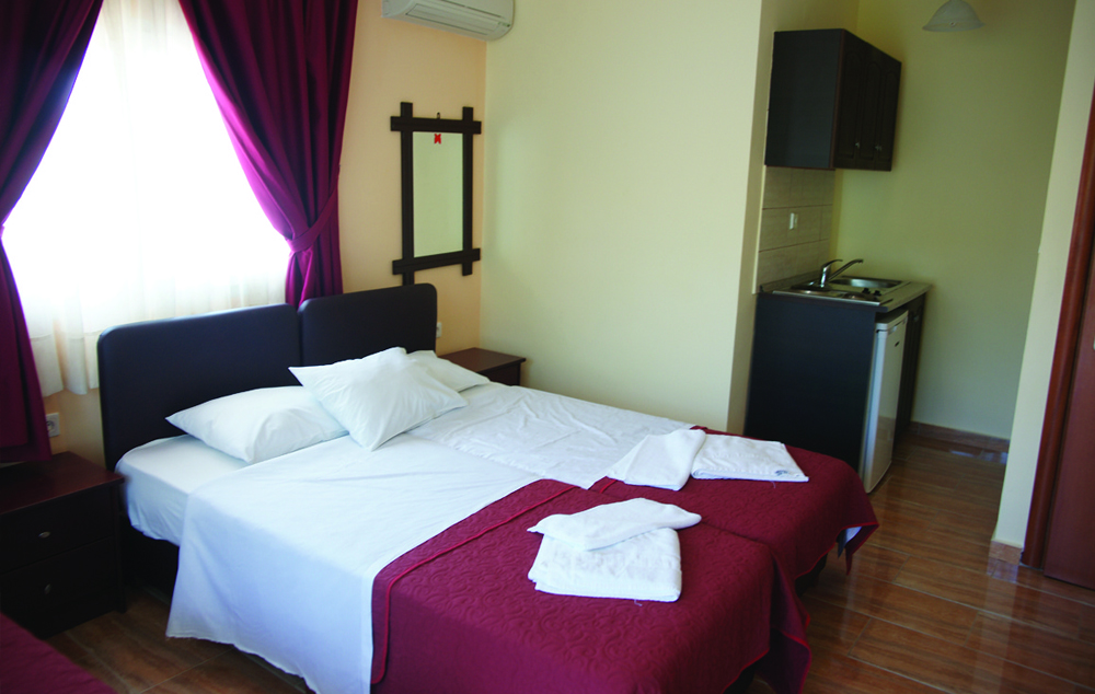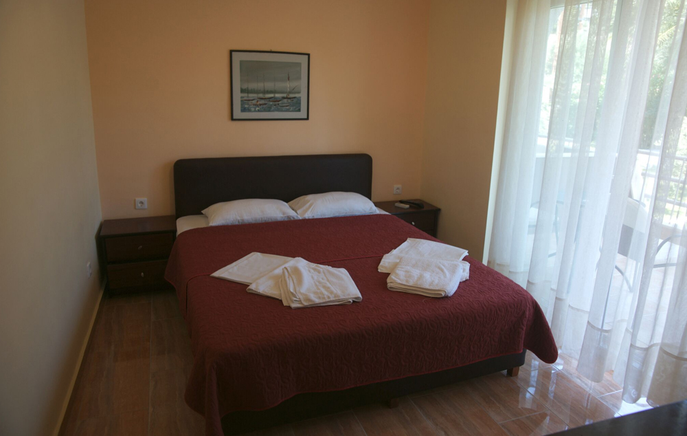 Apartment-28-30 m2, nalazi se u bungalovu ili u glavnoj zgradi sa dve odvojene sobe, sa pogledom na more ili baštu (predviđen za 2-5 osoba), čajna kuhinja bez opreme za kuvanje.