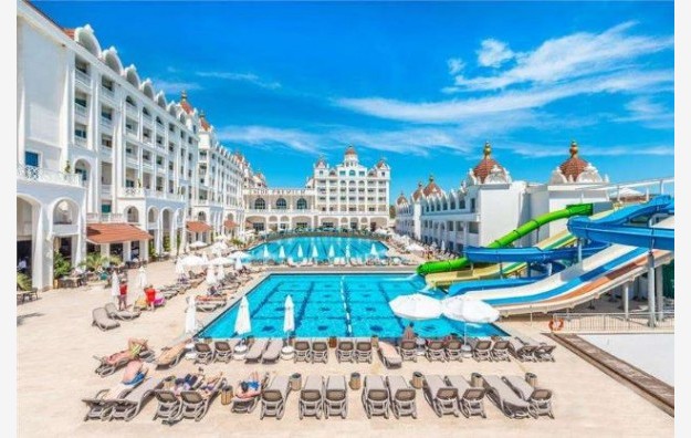 Hotelski sadržaj: Recepcija, 2 glavna restorana, 2 a la carte restorana, dijetalni meni, 13 barova, 2 unutrašnja i 5 spoljašnjih bazena, 5 dečijih bazena, 6 đakuzija, akva park sa 19 tobogana (10 dečijih), bioskopska sala, dnevne i večernje animacije, mini klub (za decu od 4-12 godina), teenage klub (za decu od 13-17 godina), mini disko, igraonica, aerobic u vodi, bocanje, pikado, stoni tenis, odbojka na pesku, teniski teren, košarka, tursko veče, hamam, sauna, parna soba, teretana, bilijar (uz doplatu), wi fi (u lobiju).