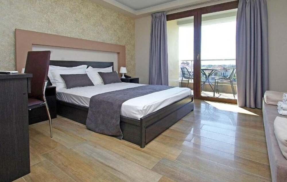 Deluxe Suite with Jacuzzi-Prostrani apartman od 35 kvadratnih metara. potpuno opremljen sa velikom terasom i delimičnim pogledom na zaliv Termaikos. Ima 1 bračni krevet, 1 trosed i fotelju gde se otvaraju.