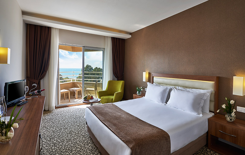 Sobe: Hotelski kompleks se sastoji od glavne zgrade i klub zgrade i raspolaže sa 264 sobe. U glavnoj zgradi se nalaze 144 standardne sobe sa pogledom na kopno ili na more, površine 27m². Sve sobe su klimatizovane, imaju SATTV, mini bar (besplatno – voda i bezalkoholna pića), sef (uz doplatu), tuš, fen, telefon, balkon. Maksimalno borave 3 odrasle osobe. Porodične sobe su površine 32 m² i isto su opremljene kao standard sobe. Sastoje se iz dve prostorije odvojene vratima. Maksimalno borave 3 odrasle osobe i 1 dete od 12 godina. Family sobe u glavnoj zgradi nemaju balkon. U klub zgradi se nalazi 75 Club soba, površine 25 m², isto su opremljene kao standard sobe. Maksimalno borave 3 odrasle osobe.