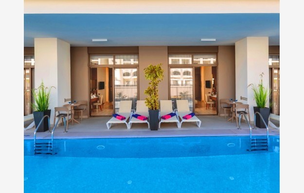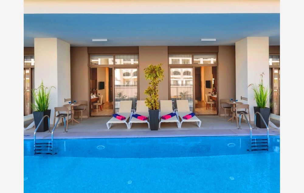 Swim up sobe (35m2). Sadrže francuski ležaj i jedan odvojen ležaj. Samo za odrasle osobe, sa izlazom na bazen, za maksimalno tri osobe.