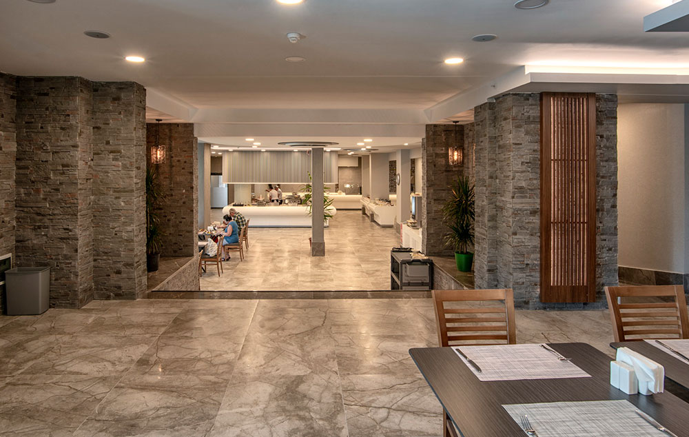 Hotelski sadržaj: Recepcija, glavni restoran, a la carte restoran, bar pored bazena, bar na plaži, bazen za odrasle, dečiji bazen, dva tobogana, dečije igralište, dnevnu animaciju, večernji mini disko, fitness, tursko kupatilo, saunu, stoni tenis, bilijar, wi fi se doplaćuje.