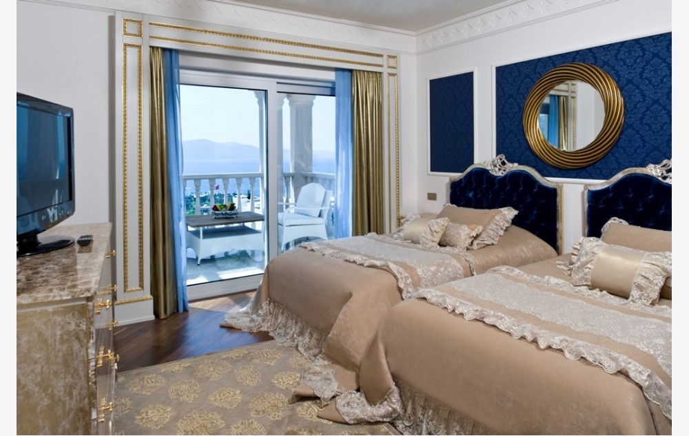 Sobe: Deluxe sobe u glavnoj zgradi ili u bašti sa pogledom na baštu ili na more, veličine oko 42m² sa kupatilom (tuš/wc i fen za sušenje kose), mini-bar (dnevno se dopunjava sa vodom), klima uredjaj, wifi, TV, sef (besplatno korišćenje), ketler, balkon. Maksimalno borave 2 odrasle osobe i 1 dete do 12 godina. Premium sobe veličine oko 52m2 sa pogledom na more, smeštene u bašti i isto su opremljene kao deluxe sobe. Maksimalno borave 2 odrasle osobe i 2 dece do 12 i 3 godine. Suite sobe imaju 54m2 i sastoje se od dve prostorije, odvojene vratima. Nalaze se u glavnoj zgradi i imaju pogled na baštu Maksimalno borave 2 odrasle osobe i 2 dece do 12 godina. Superior suite soba sa pogledom na baštu, veličine oko 92m2 sastoji se od dve velike sobe i dnevne sobe. Maksimalno borave 4 odrasle osobe i 2 dece do 12 godina. Hotel poseduje i sobe drugačijih sturktura i drugačije opremljenosti.