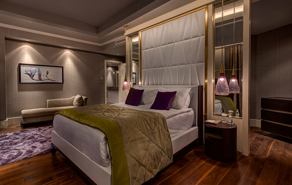 Deluxe suite pogled more (100m2). Sastoji se od dnevne sobe sa ugaonom garniturom i spavaće sobe sa francuskim ležajem. Maksimalno mogu da borave tri odrasle osobe i jedno dete do 3 godine.