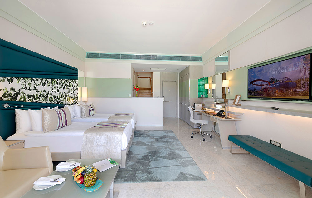 Pool suite (45m2). Sastoji se od spavaće sobe sa francuskim ležajem i dnevne sobe sa sofom. Maksimalno mogu da borave dve odrasle osobe i dvoje dece do 12 i 3 godine.