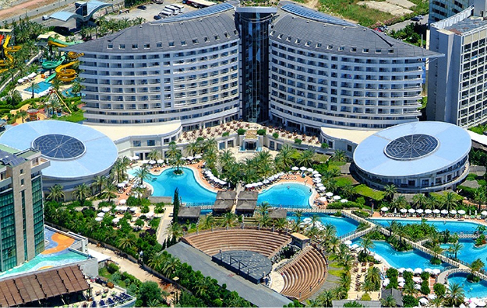 Hotelski sadržaj: Recepcija, 2 glavna restorana, 2 a la carte restorana, dijetalni meni, 13 barova, 2 unutrašnja i 5 spoljašnjih bazena, 5 dečijih bazena, 6 đakuzija, akva park sa 19 tobogana (10 dečijih), bioskopska sala, dnevne i večernje animacije, mini klub (za decu od 4-12 godina), teenage klub (za decu od 13-17 godina), mini disko, igraonica, aerobic u vodi, bocanje, pikado, stoni tenis, odbojka na pesku, teniski teren, košarka, tursko veče, hamam, sauna, parna soba, teretana, bilijar (uz doplatu), wi fi (u lobiju).