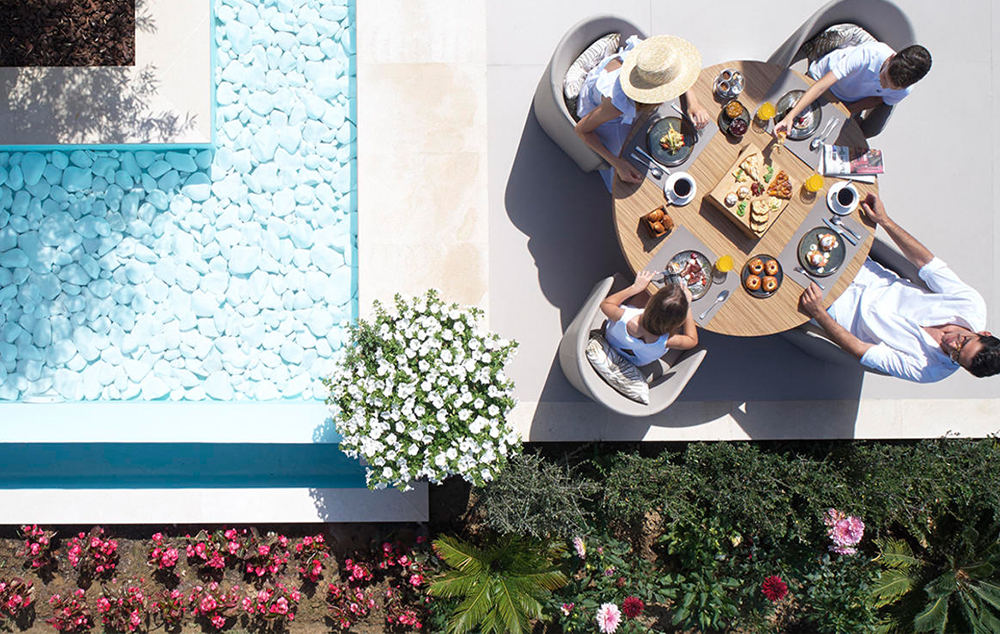 Junior Suite Private Garden-Velikodušno prostran stan niske spratnosti, koji nudi savremeni dizajn i udobnost. Panoramski prozori gledaju na zelene bašte i bazene, dok prostrana baštenska terasa predstavlja savršen prostor za opuštanje. Prostrano kupatilo dolazi sa ekskluzivnim priborom Anne Semonin. Terasa sa luksuznim nameštajem, 2 ležaljke, stolić i stolice, pod od pločica, unutrašnji prostor 44 m2.