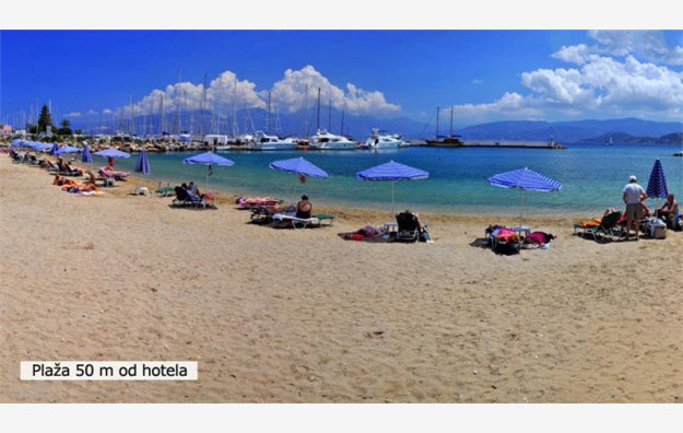 Smešten je na svega 50 m od uređene peščane plaže Amos, nagrađene plavom zastavicom, gde su ležaljke i suncobrani na raspolaganju gostima (uz doplatu na licu mesta). Peškiri za plažu su dostupni uz depozit.