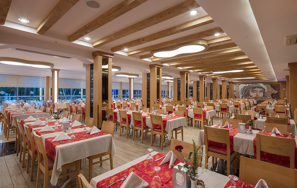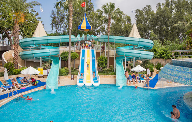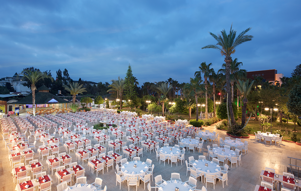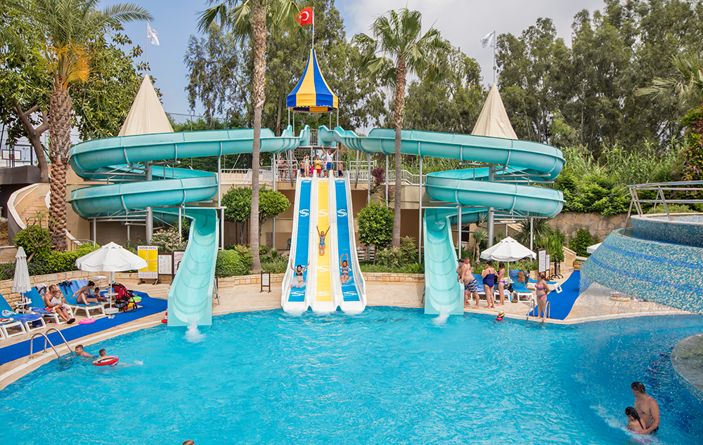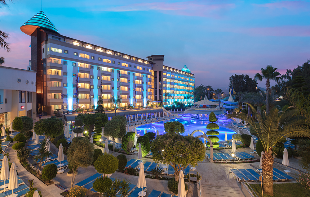 Hotelski sadržaj: Recepcija, 2 glavna restorana, 2 a la carte restorana, dijetalni meni, 13 barova, 2 unutrašnja i 5 spoljašnjih bazena, 5 dečijih bazena, 6 đakuzija, akva park sa 19 tobogana (10 dečijih), bioskopska sala, dnevne i večernje animacije, mini klub (za decu od 4-12 godina), teenage klub (za decu od 13-17 godina), mini disko, igraonica, aerobic u vodi, bocanje, pikado, stoni tenis, odbojka na pesku, teniski teren, košarka, tursko veče, hamam, sauna, parna soba, teretana, bilijar (uz doplatu), wi fi (u lobiju).