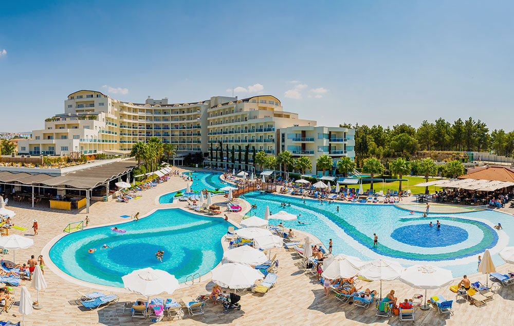 Položaj: hotel je lociran na samoj plaži. Udaljen je 130km od aerodroma Milas u Bodrumu i 5km od centra Kušadasija. Hotel je poslednji put renoviran 2018.godine. Zauzima površinu od oko 38.000 m2.
