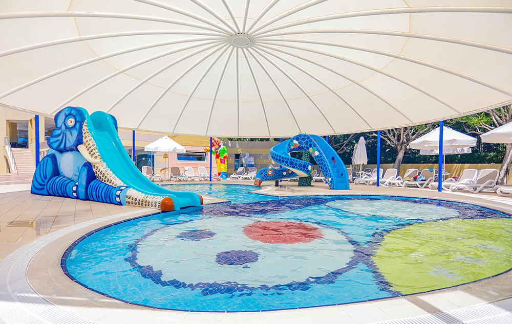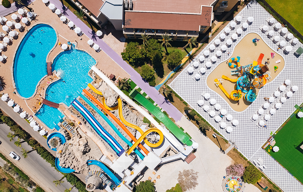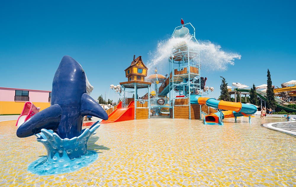 Hotelski sadržaj: Dva glavna restorana, tri a’la carte restorana (uz rezervaciju), 10 barova, 5 konferencijskih sala, bioskopska sala, 2 unutrašnja bazena, 7 spoljašnjih bazena, akva park sa 14 tobogana, teretana, aerobik, akvabik, košarka, odbojka na pesku, odbojka, teniski tereni, pikado, boćanje, badminton, diskoteka, muzika uživo, dnevna i večernja animacija, 4 dečijia bazena, 2 dečija kluba (mini 4-8 i junior klub 13-17 godina), luna park, dečiji meni, dečije igralište, spa centar (hamam i sauna - besplatno). Wifi je dostupan na celoj teritoriji hotela.