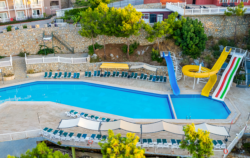 Hotelski sadržaj: Recepcija, glavni restoran, bar pored bazena, bazen za odrasle sa toboganom i odvojenim delom za decu, spa (tursko kupatilo, sauna i masaže-sve uz doplatu).