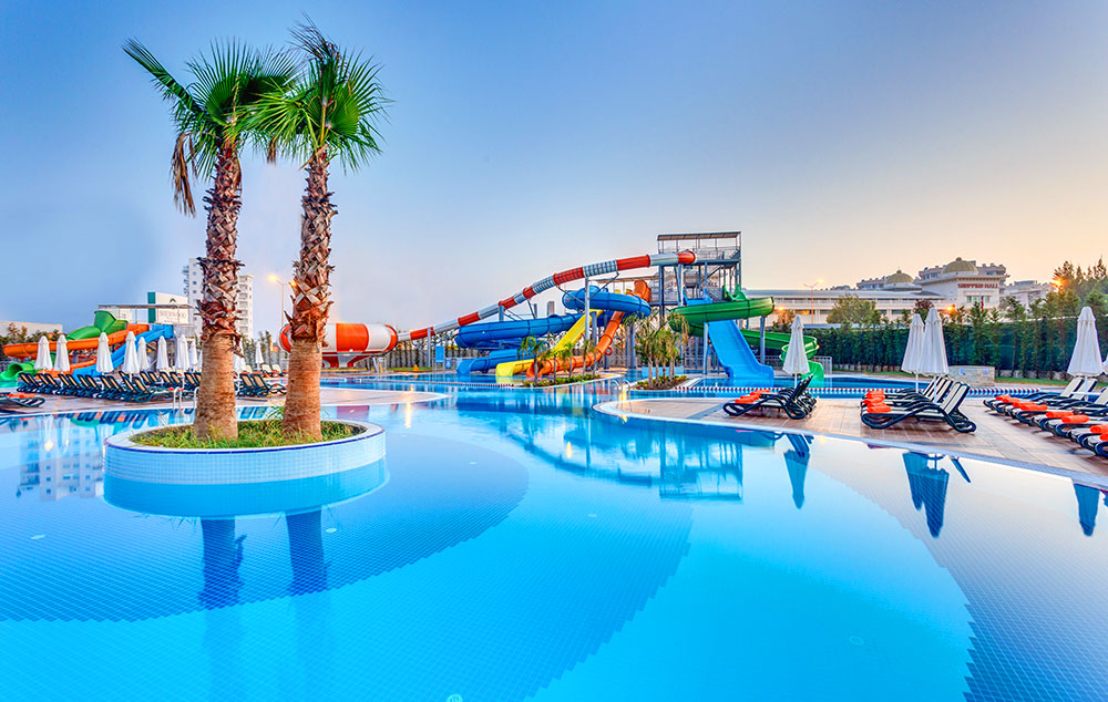 Hotelski sadržaj: Recepcija, 2 glavna restorana, 2 a la carte restorana, dijetalni meni, 13 barova, 2 unutrašnja i 5 spoljašnjih bazena, 5 dečijih bazena, 6 đakuzija, akva park sa 19 tobogana (10 dečijih), bioskopska sala, dnevne i večernje animacije, mini klub (za decu od 4-12 godina), teenage klub (za decu od 13-17 godina), mini disko, igraonica, aerobic u vodi, bocanje, pikado, stoni tenis, odbojka na pesku, teniski teren, košarka, tursko veče, hamam, sauna, parna soba, teretana, bilijar (uz doplatu), wi fi (u lobiju).