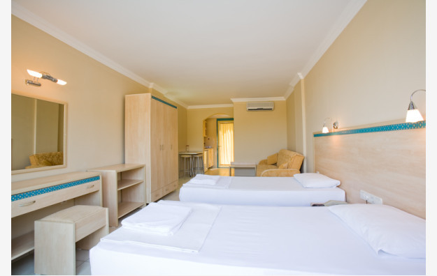 Studio sobe su veličine oko 30m2 i imaju kupatilo (tuš-wc, fen za sušenje kose), sat TV, telefon, klimu (uz doplatu-9eur po danu, po sobi), mini bar, sto i stolice, mini kuhinja, francuski balkon ili balkon, wifi. Maksimalno borave 2 odrasle osobe i 1 dete do 3 godine.