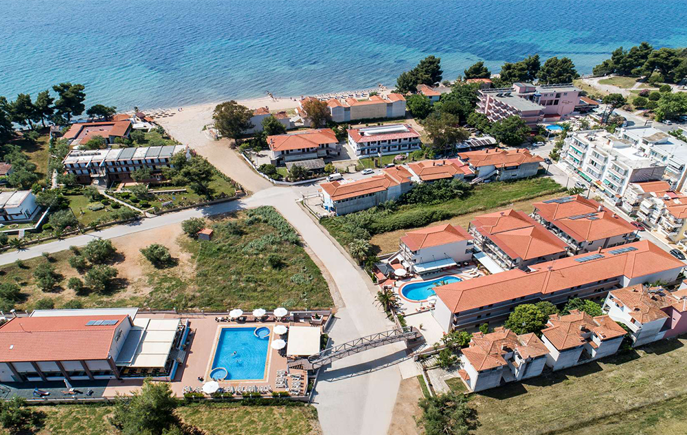 LOKACIJA: Mali porodični hotel, nalazi se u srcu Sitonije, u prelepom okruženju malog mesta Metamorfosi. Svojim gostima nudi apsolutni mir i opuštanje na 70-ak metara od mora. Hotel ima ukupno 90 soba raspoređenih u 6 zgrada.