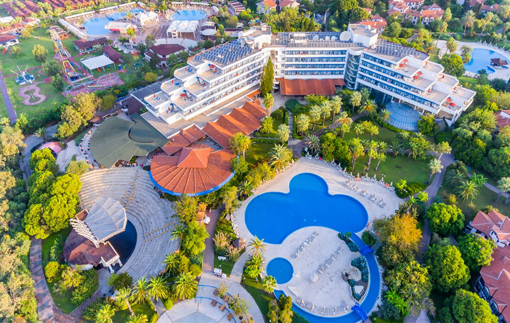 Hotelski sadržaj: Recepcija, 2 glavna restorana, 2 a la carte restorana, dijetalni meni, 13 barova, 2 unutrašnja i 5 spoljašnjih bazena, 5 dečijih bazena, 6 đakuzija, akva park sa 19 tobogana (10 dečijih), bioskopska sala, dnevne i večernje animacije, mini klub (za decu od 4-12 godina), teenage klub (za decu od 13-17 godina), mini disko, igraonica, aerobic u vodi, bocanje, pikado, stoni tenis, odbojka na pesku, teniski teren, košarka, tursko veče, hamam, sauna, parna soba, teretana, bilijar (uz doplatu), wi fi (u lobiju).