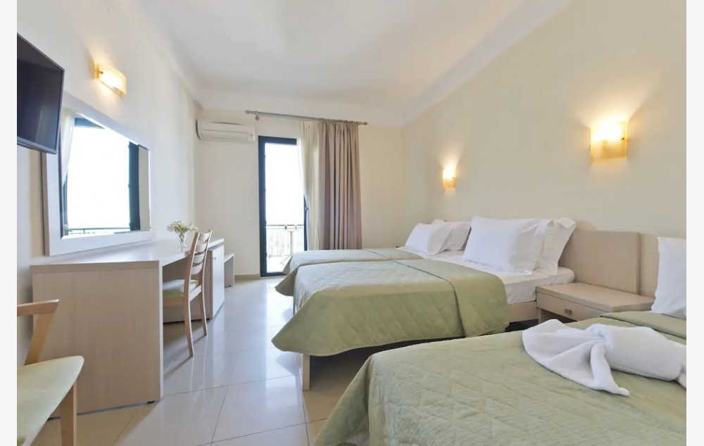 Family Apartment Sea View – Porodične sobe otvorenog tipa, površine 32 m², opremljene bračnim ili dva odvojena kreveta u jednom prostoru i kaučem na razvlačenje ili dodatnim krevetima u vizuelno odvojenom prostoru (bez vrata između), sopstvenim kupatilom i nameštenim balkonom s pogledom na more.