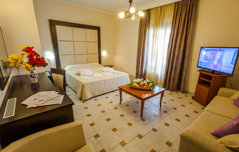 Executive Room- Sobe otvorenog tipa, površine 20-22 m2, nedavno renovirane, opremljene bračnim krevetom i dodatnim krevetom ili dečjim krevetićem, sopstvenim kupatilom s tušem i francuskim balkonom ili velikim prozorima s pogledom na vrt.