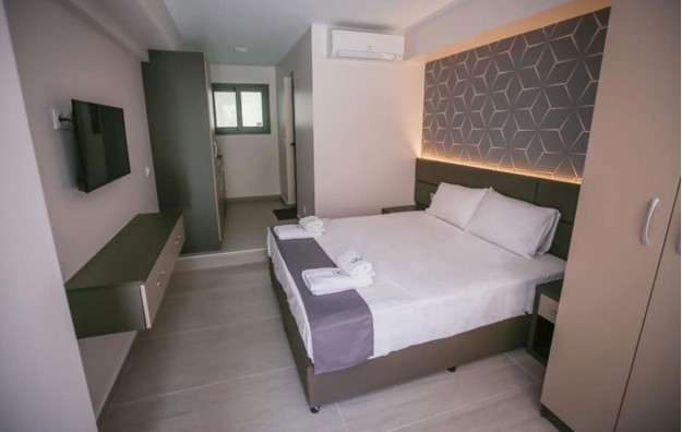 Opis: Poseduje dvokrevetna studija koja su smeštena u prizemlju. Svaki od njih ima opremljen kuhinjski deo, kupatilo/wc, terasu, TV, WiFi internet i klima uređaj (uključen u cenu aranžmana). U neposrednoj blizini se nalaze supermarketi, pekare, restorani, kafići i ostali sadržaji.