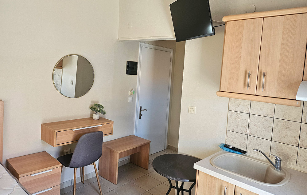 Opis: U našoj ponudi su dvokrevetni studiji, koja su na drugom spratu. Svaka smeštajna jedinica ima čajnu kuhinju, kupatilo/wc, terasu, TV, WiFi internet I klima uređaj (uključen u cenu aranžmana).