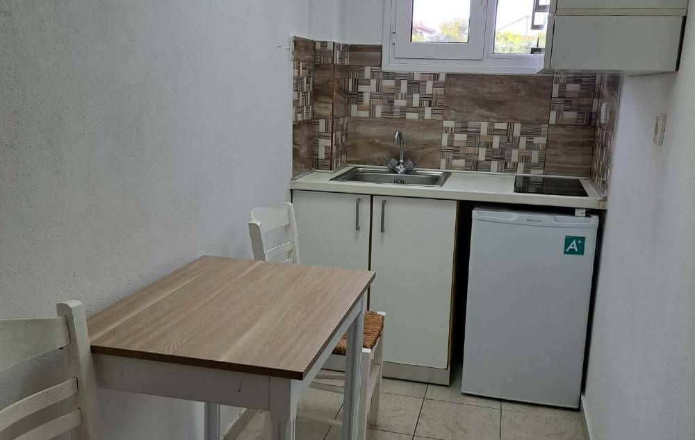 Opis: Smeštajne jedinice u našoj ponudi su dvokrevetni i trokrevetni studiji, kao i jedan promo studio, a nalaze se u prizemlju i na drugom spratu . Svaki studio poseduje opremljen kuhinjski deo, kupatilo/wc, peškire, terasu (osim promo studia), TV, WiFi internet i klima uređaj (uz doplatu na licu mesta od 5€ dnevno). Promo studio nema terasu, već se garnitura za sedenje nalazi u zajedničkom dvorištu.
