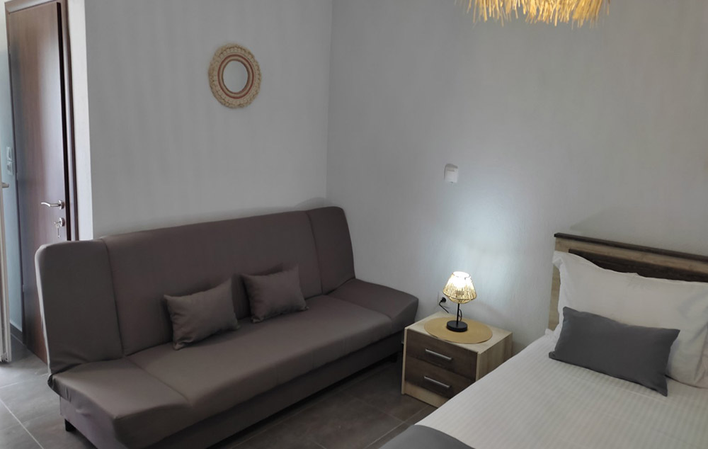 Opis: Sve smeštajne jedinice iz naše ponude su dvokrevetne i trokrevetne i nalaze se u prizemlju i na prvom spratu. Svaki studio poseduje opremljeni kuhinjski deo, kupatilo/wc, terasu, komarnike, TV, WiFi internet i klima uređaj (uz doplatu na licu mesta od 6€ dnevno).