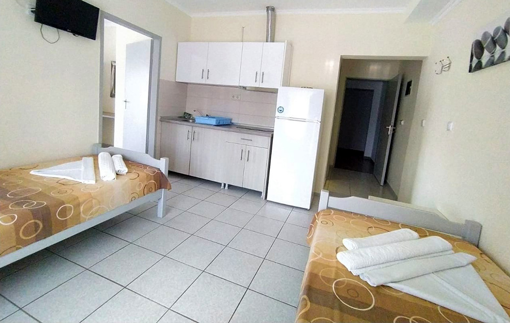 Opis: Poseduje dvokrevetne, trokrevetne i četvorokrevetne studije, koji se nalaze na visokom prizemlju ili prvom spratu. Svaka od smeštajnih jedinica ima opremljen kuhinjski deo, kupatilo/wc, terasu, TV, WiFi internet i klima uređaj (uz doplatu na licu mesta od 6€ dnevno).