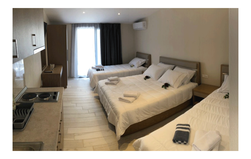 Opis: Vila raspolaže sa moderno opremljenim, dvokrevetnim i trokrevetnim studijima, koji se nalaze u spuštenom prizemlju. Studija su izgrađena za sezonu leto 2017. godine. Svaka smeštajna jedinica ima kompletno opremljenu kuhinju, kupatilo/wc, terasu, TV, WiFi internet i klima uređaj (uz doplatu na licu mesta od 6€ dnevno).