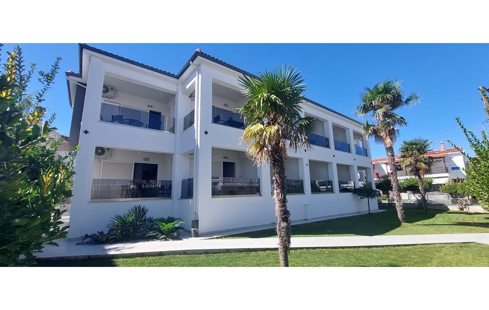 Opis: Izvrsna lokacija na kojoj se nalazi, pruža mogućnost mirnog odmora. Vila je deo kompleksa, a raspolaže dvokrevetnim, trokrevetnim i četvorokrevetnim studijima, kao i apartmanima i mezonetama, koje su namenjene za smeštaj od četiri do šest osoba. Smeštajne jedinice se nalaze u prizemlju ili na prvom spratu, sve su renovirane, a većina ih ima pogled na more. Sve smeštajne jedinice poseduju opremljen kuhinjski deo, kupatilo/wc, terasu sa garniturom za sedenje, TV, WiFi i klima uređaj (uz doplatu na licu mesta od 7€ dnevno). Nedaleko od vile nalaze se market, pekara, suvenirnica, veliki broj restorana, kafića i butika. U prvoj zgradi se nalazi i prelep kafe-restoran (beach bar), koji vam pruža mogućnost dodatnog odmora uz veliki izbor pića uz pogled na more. Parking za goste koji dolaze automobilom je moguć u neposrednoj blizini na javnom parkingu.