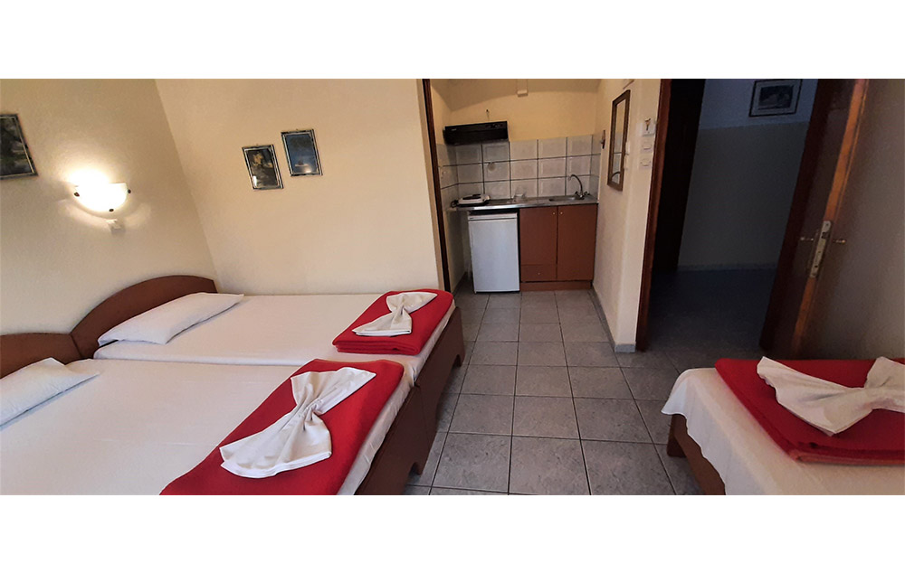 Opis: U našoj ponudi su studija i dupleks apartmani, koji se nalaze na prvom spratu. Sve smeštajne jedinice su renovirane. Svaki studio/dupleks ima opremljenu kuhinju, kupatilo/wc, terasu, TV, WiFi internet, klima uređaj (uz doplatu na licu mesta, od 7€ dnevno).