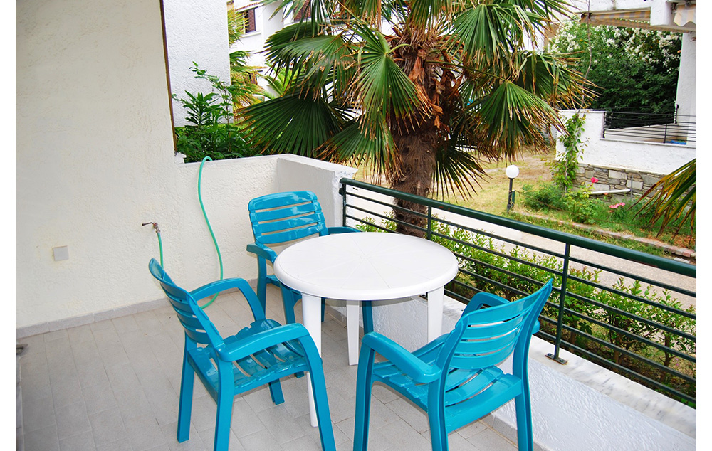 Manji dvokrevetni + 1 studiji (STD 1/2, STD 1/2+1) se nalaze u malo izdignutom prizemlju i na prvom spratu. Lepe i velike terase (sa garniturom za sedenje) gledaju ka vrtu. Studiji su manji, ali funkcionalni i u njima se pored standardnog ležaja, nalazi i prošireni ležaj (francuski ležaj po grčkim standardima-120 cm) na kojem može spavati jedan od roditelja sa detetom. Pored čajne kuhinje sa odgovarajućim posudjem i malim frižiderom (40 l sa komoricom za led) studio je opremljen TV-om, klima uredjajem (uz doplatu na licu mesta (opcija), 5 eur dnevno po studiju), wi – fi Iinternetom, ima malo kupatilo i lepu terasu sa garniturom za sedenje. Ležaljke i suncobrani oko bazena se ne naplaćuju. Studiji su ograničeni na maksimum dve odrasle osobe i dete dodvanaest godina (koje deli prošireni ležaj sa roditeljem). Veličina studija je cca 16 kvm + terasa.